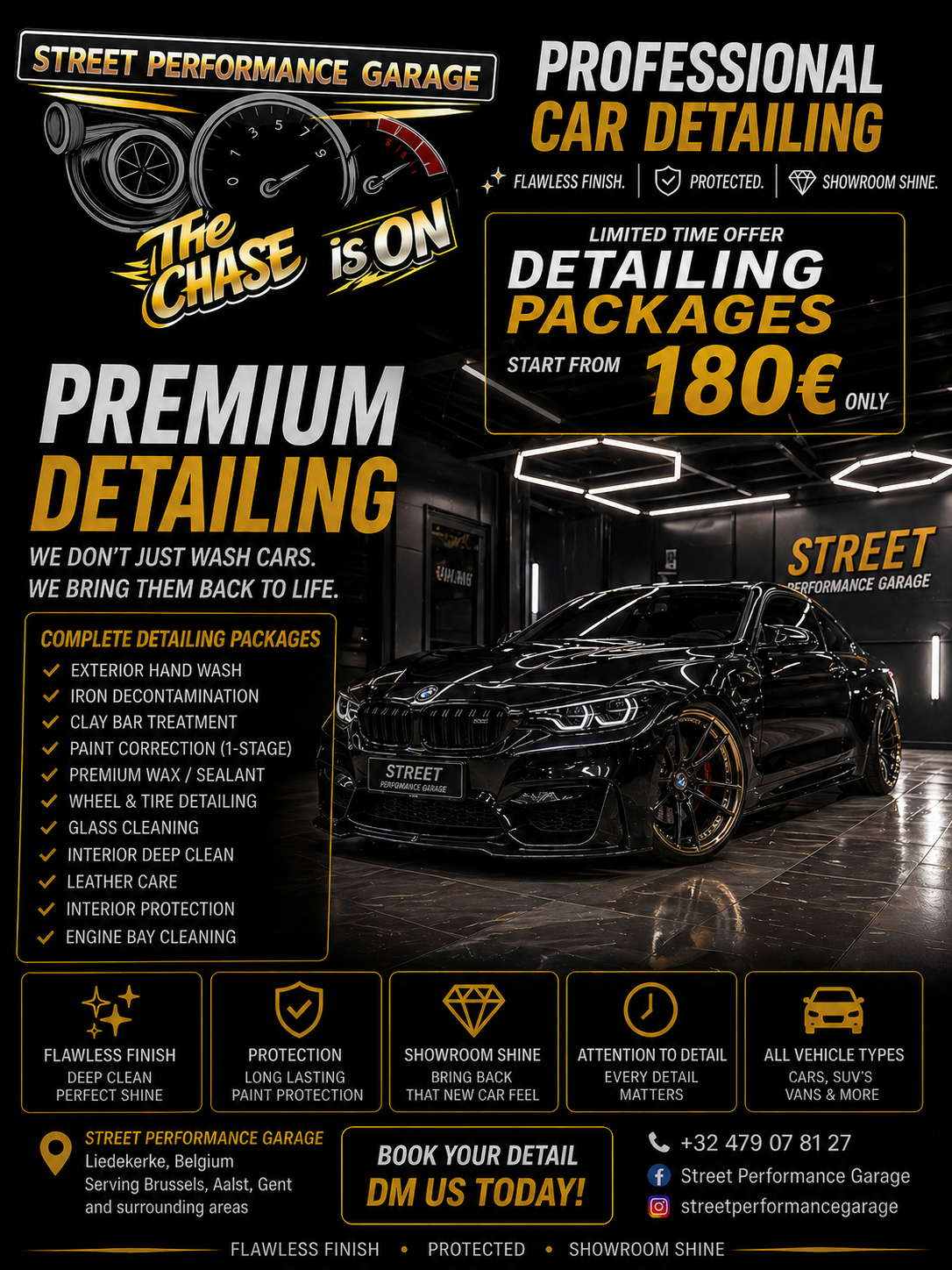 Car detailing at Street Performance Garage is a professional deep cleaning and restoration service that goes far beyond a simple car wash. We take care of every detail—inside and out—to bring your car back to its best condition.